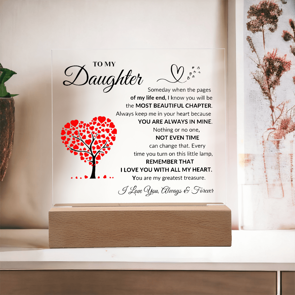 Your plaque will be crafted from premium acrylic with a professionally printed design for a polished look. It comes with a stylish wooden LED base, and you can choose between a USB plug-in option OR a cordless battery-operated option (requires 2 AAA batteries, not included). Both LED bases feature 7 vibrant colors, allowing the user to customize the lighting with various color changes and dynamic cycles.